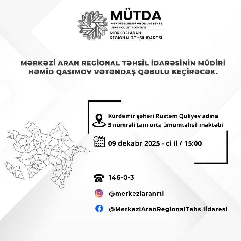 Mərkəzi Aran Regional Təhsil İdarəsinin müdiri Həmid Qasımov dekabr ayının 9-da Kürdəmir şəhəri Rüstəm Quliyev adına 5 nömrəli tam orta ümumtəhsil məktəbində vətəndaşları qəbul edəcək.